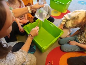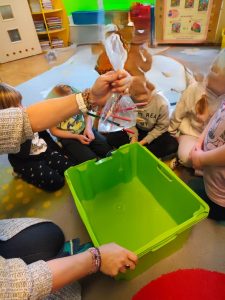 Podczas ferii zimowych realizowaliśmy blok tematyczny „Woda – eksperymenty i przygoda”. Był to czas pełen odkrywania, doświadczania i świetnej zabawy. Dzieci poznały właściwości wody poprzez eksperymenty – sprawdzaliśmy, co pływa, a co tonie, obserwowaliśmy mieszanie się substancji, tworzyliśmy kolorowe „lawy” w butelkach oraz badaliśmy, w jaki sposób woda zmienia swój stan skupienia.